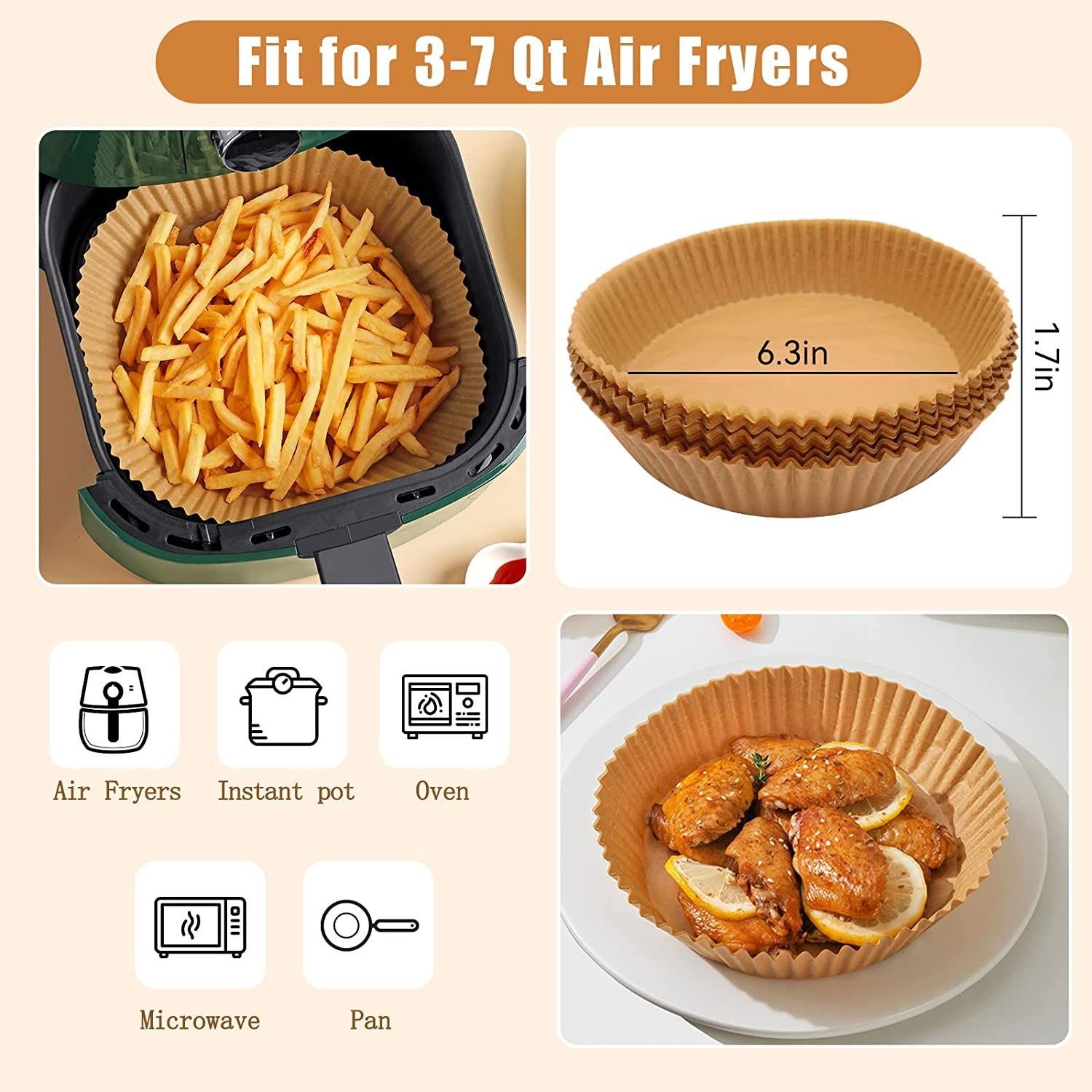 Keep Clean:These disposable paper liners are a great way to keep food debris from splattering all over the place; and if you hate having to clean your air fryer after every use; it will keep your air fryer clean as new and extend the life of your air fryer.