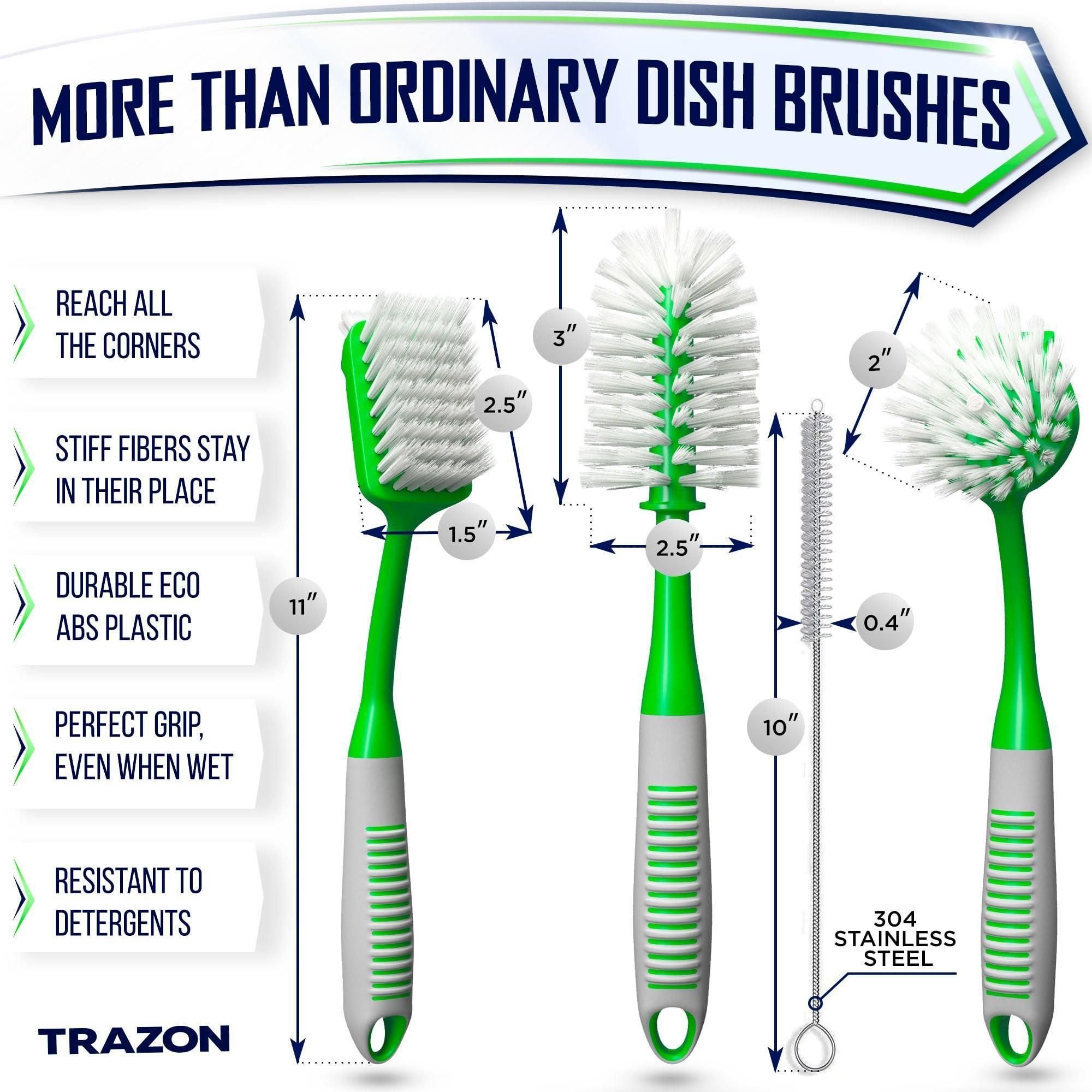 1.Kitchen Dish Brush Set. Find immense joy in washing dishes with our kitchen cleaning brush kit. It includes a large bottle brush, a long-handle brush for dishes, and a dish scrubber with handle. With a variety of kitchen brushes for dishes, youll easily take on everyday dish cleaning removing even the most stubborn dirt. They will also do for keeping all your pots, pans, bowls, bottles, sinks, and other household stuff clean.