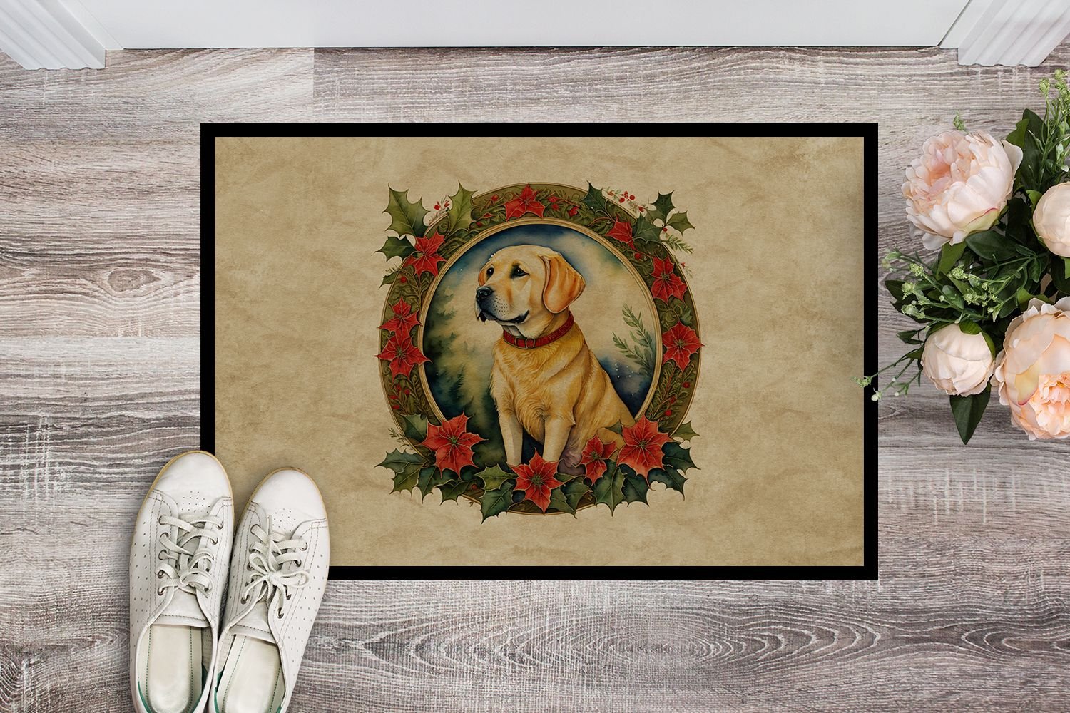 Home > NEW Labrador Retriever Christmas Flowers Doormat Front Door Mat Indoor Outdoor Rugs for Entryway, Non Slip Washable Low Pile, 18H X 27W