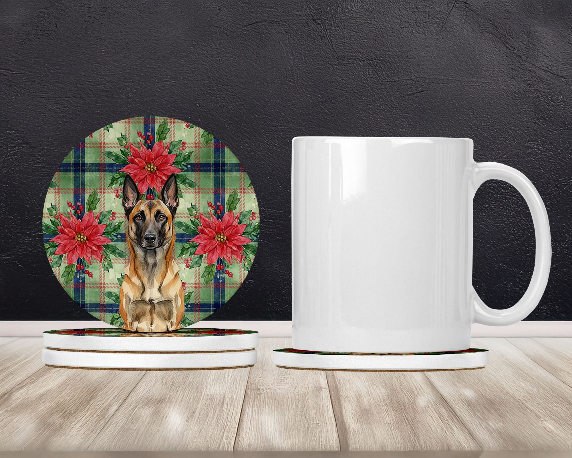 Belgian Malinois Christmas PoinsettIas Large Sandstone Coasters Pack of 4 Absorbent Round Coasters Decor Gifts for Men or Women, 4 in, Multicolor