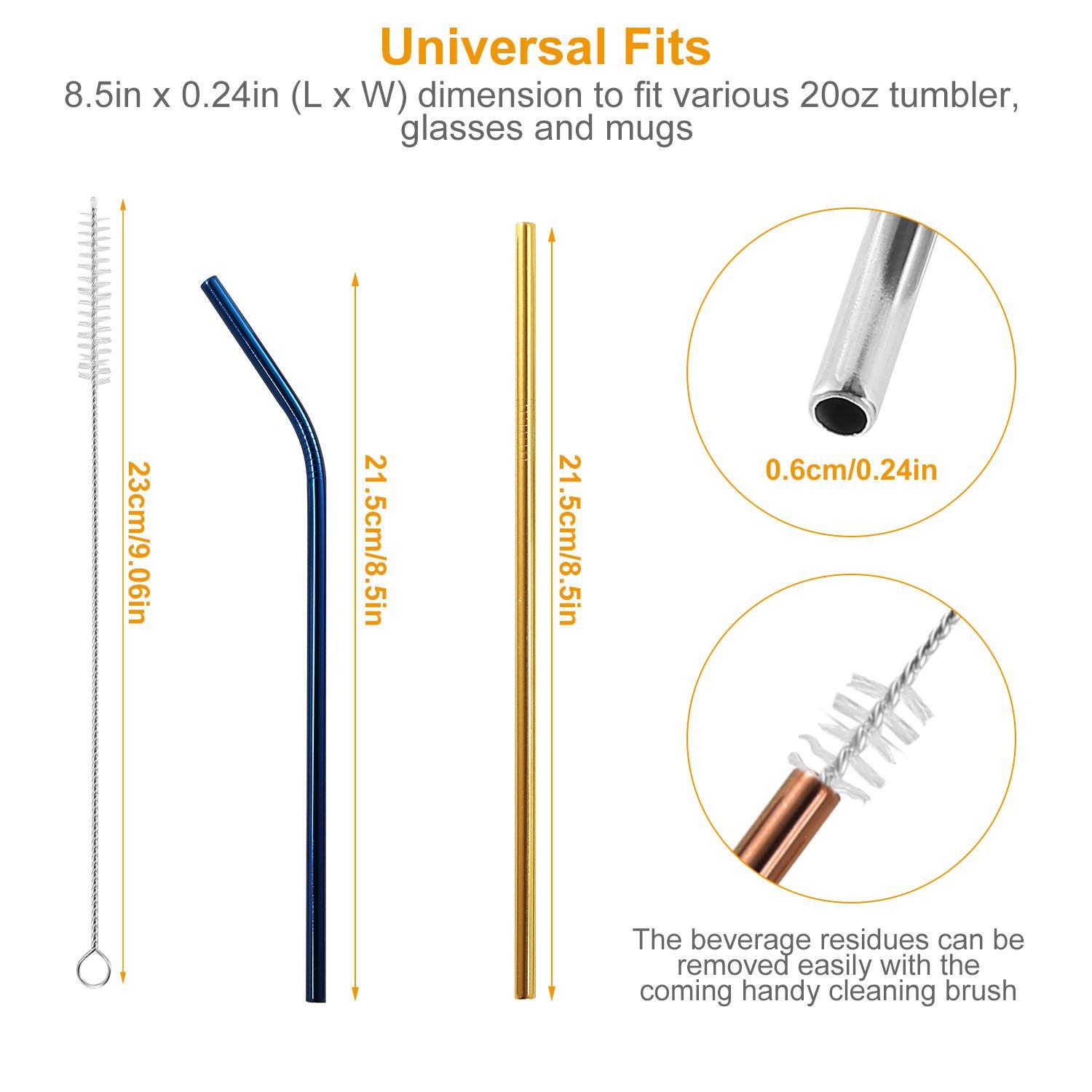 *Universal Fits*:Owning an 8.5in x .24in(L x W) dimension to fit most daily drinking-various fruit and vegetable juice; milk; tea; coffee; milkshake; sorbet; beer; water; etc.-in approx. 20oz tumbler; glasses and mugs.